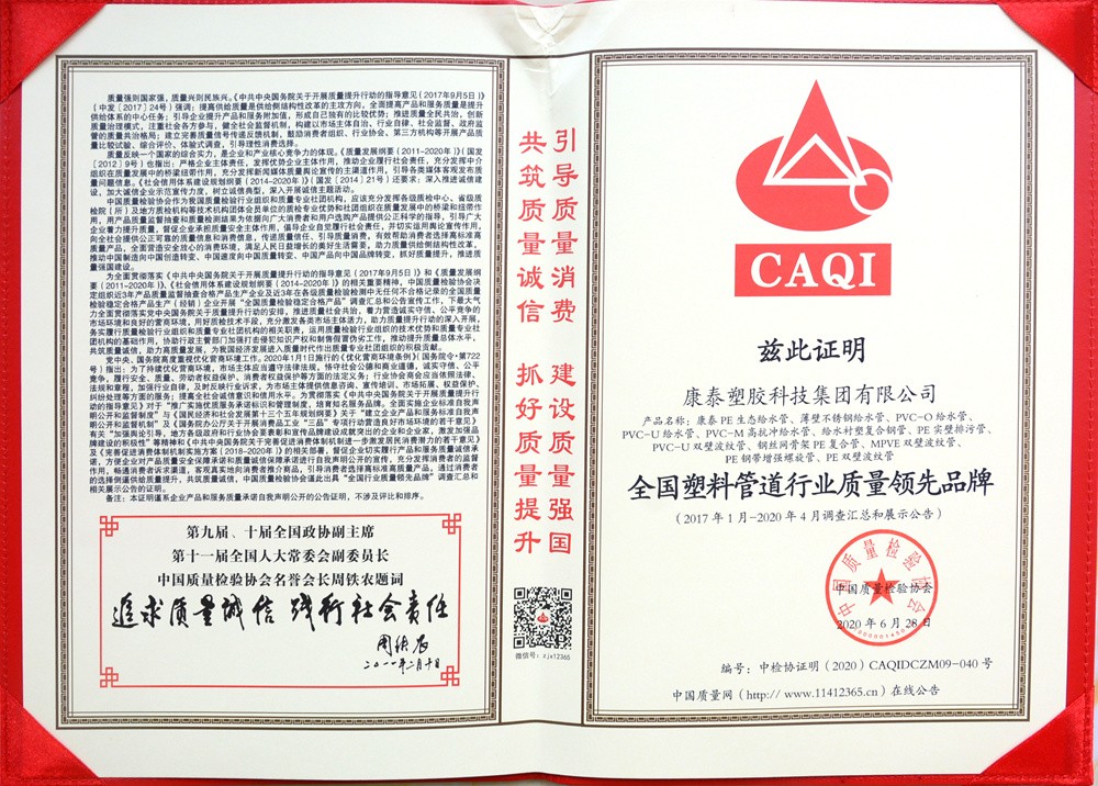 近日,康泰在中國質(zhì)量檢驗協(xié)會主辦主題活動中,榮獲“全國質(zhì)量誠信先進企業(yè)”稱號,同時還獲得“全國塑料管道行業(yè)質(zhì)量領(lǐng)先品牌”、“全國質(zhì)量檢驗穩(wěn)定合格產(chǎn)品”等榮譽。