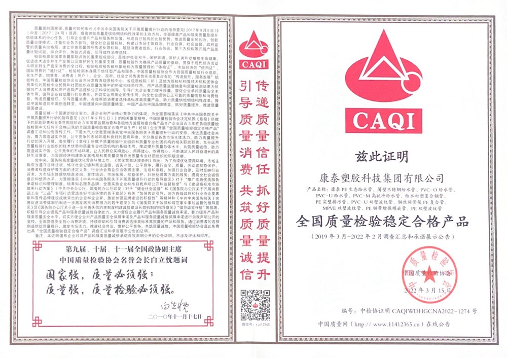 塑料管道行業(yè)是一個特殊的行業(yè),質(zhì)量是這個行業(yè)的生命線。產(chǎn)品的好壞關(guān)系到萬千家庭的健康與安全。憑著對初心的執(zhí)著堅守,康泰率先通過了ISO9001國際質(zhì)量管理體系認證,更是成為參與塑料管道行業(yè)標準、國家標準編寫和制定的骨干企業(yè)。