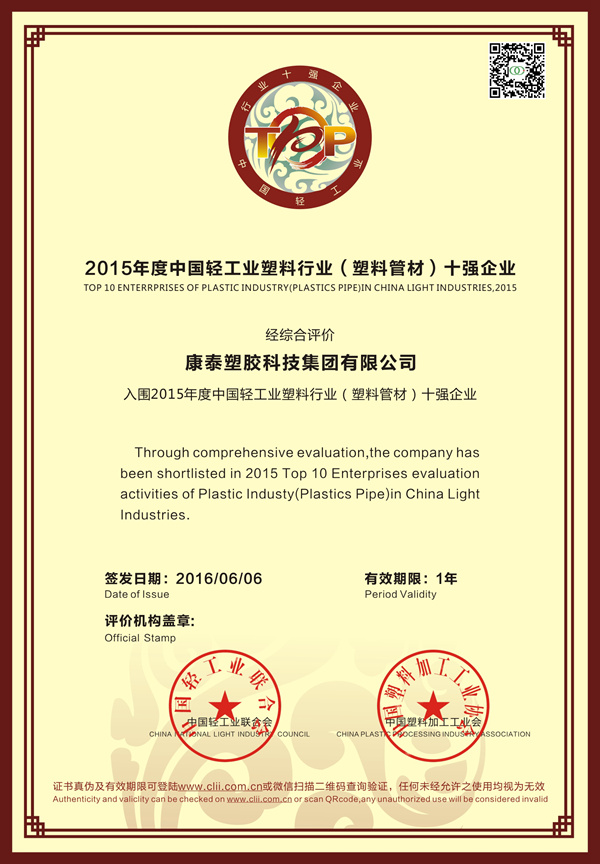 ? ? ? ?此次蟬聯(lián)行業(yè)十強,也將激勵康泰繼續(xù)前行,為“為每個家庭提供安全環(huán)保的建材”而努力!