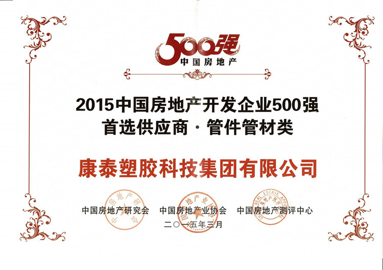?????? 日前,“2015中國(guó)房地產(chǎn)500強(qiáng)測(cè)評(píng)成果發(fā)布會(huì)暨500強(qiáng)峰會(huì)”在北京國(guó)貿(mào)隆重舉行。值得恭賀的是,康泰集團(tuán)首次入圍“地產(chǎn)500強(qiáng)首選供應(yīng)商 管件管材類(lèi)”榜單,獲得了由中國(guó)房地產(chǎn)研究會(huì)、中國(guó)房地產(chǎn)業(yè)協(xié)會(huì)和中國(guó)房地產(chǎn)測(cè)評(píng)中心聯(lián)合頒發(fā)的“2015中國(guó)房地產(chǎn)開(kāi)發(fā)企業(yè)500強(qiáng)首選供應(yīng)商品牌”榮譽(yù)證書(shū)。