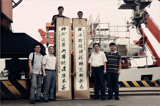 ??? 由于天氣的原因,臨時(shí)接到國(guó)家海洋局的通知將原定于6月25日在江陰港出航的蛟龍?zhí)栄悠谥?月4號(hào)在福州馬尾港出航,因此鄭總一行的主要目的在于與基地領(lǐng)導(dǎo)洽淡交流以及參觀合影,贈(zèng)聯(lián)獻(xiàn)禮。雖無(wú)法看到蛟龍?zhí)柍孙L(fēng)破浪的英姿,但能夠零距離接觸蛟龍?zhí)柾瓿色I(xiàn)禮亦激情自豪。