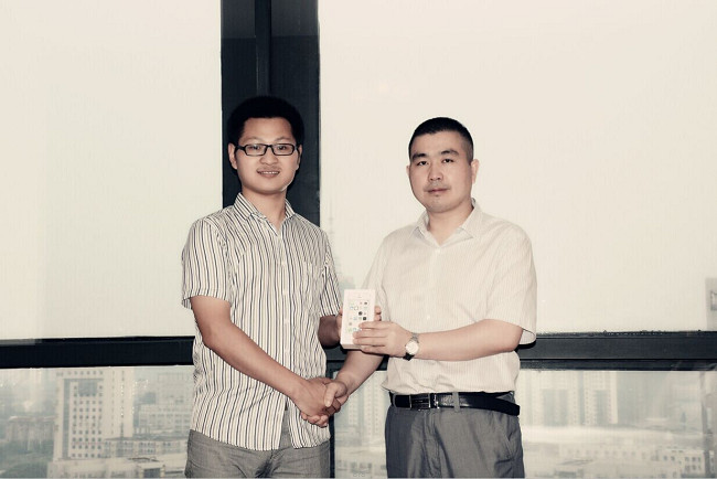 鄭總向最終勝出對(duì)聯(lián)得主渠芳慧先生頒發(fā)征聯(lián)活動(dòng)一等獎(jiǎng)蘋(píng)果5S一臺(tái)