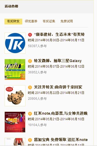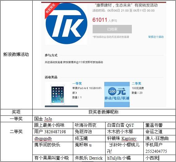 ??? 本次#康泰建材,生態(tài)未來(lái)#的新浪微博推廣活動(dòng)自6月4日起至6月10日止,共計(jì)61011人次參與活動(dòng),并榮登新浪微博活動(dòng)熱榜榜首!目前系統(tǒng)自動(dòng)抽取一名一等獎(jiǎng)獲得者,以及20名二等獎(jiǎng)獲得者。新浪有獎(jiǎng)轉(zhuǎn)發(fā)系統(tǒng)已經(jīng)通過(guò)私信的方式將獲獎(jiǎng)信息通知到相關(guān)博主,我們將在三個(gè)工作日內(nèi)收集獲獎(jiǎng)?wù)咝畔?,收集完畢?-5個(gè)工作日內(nèi)統(tǒng)一寄發(fā)獎(jiǎng)品。以下是相關(guān)獲獎(jiǎng)?wù)呙麊?,本次有?jiǎng)轉(zhuǎn)發(fā)活動(dòng)抽獎(jiǎng)由新浪系統(tǒng)自動(dòng)抽取,結(jié)果真實(shí)有效。