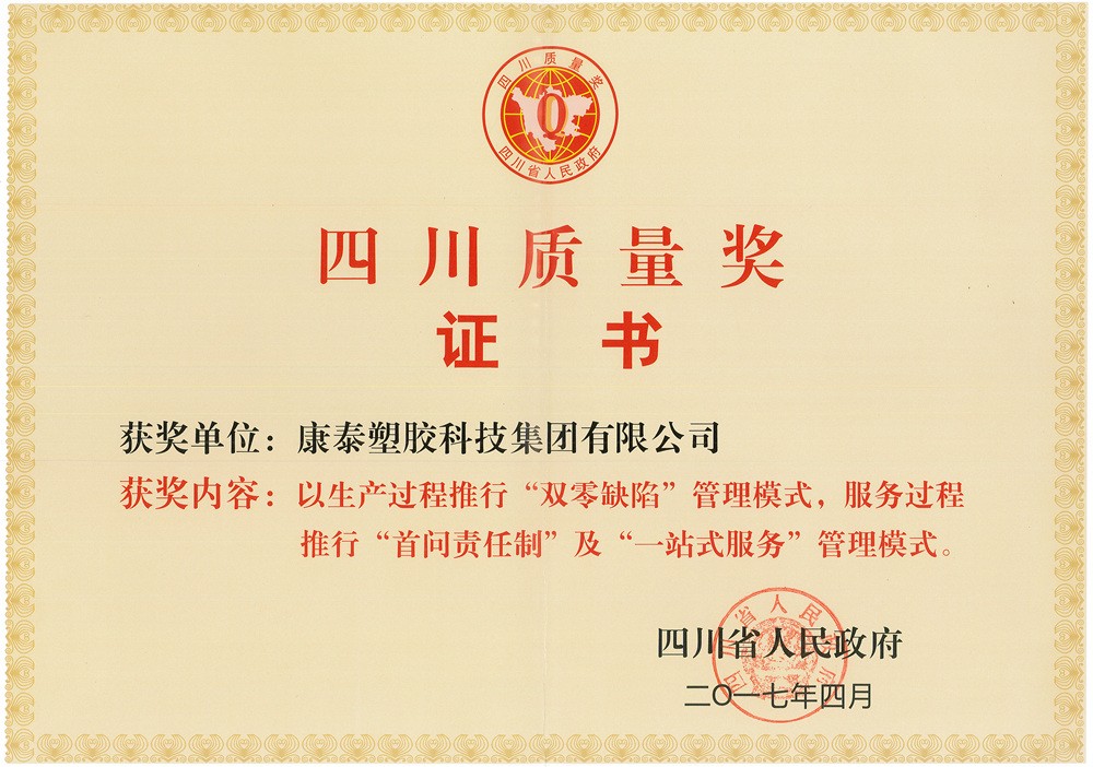 三是質(zhì)量強(qiáng)企,獲得第四屆四川質(zhì)量獎(jiǎng)??堤┘瘓F(tuán)以“圍繞全球顧客、不斷改善,追求產(chǎn)品零缺陷”的質(zhì)量方針,貫徹“產(chǎn)品如人品”的質(zhì)量理念,全面覆蓋ISO9001、ISO14001、OHSAS18001三體系,實(shí)施全員、全面質(zhì)量管理,通過(guò)導(dǎo)入PDCA循環(huán)管理和QCC體系,嚴(yán)格質(zhì)檢把控,確保從原料進(jìn)廠到產(chǎn)品出廠的優(yōu)質(zhì)質(zhì)量保障??堤┫群髽s獲全國(guó)質(zhì)量誠(chéng)信標(biāo)桿典型企業(yè)、全國(guó)質(zhì)量檢驗(yàn)穩(wěn)定合格產(chǎn)品、全國(guó)百佳質(zhì)量誠(chéng)信標(biāo)桿示范企業(yè)等榮譽(yù)稱(chēng)號(hào)。2017年,憑借“生產(chǎn)過(guò)程推行‘雙零缺陷’管理模式,即供應(yīng)鏈來(lái)料100%合格進(jìn)廠、產(chǎn)品質(zhì)量100%合格出廠,始終貫徹執(zhí)行態(tài)度零容忍、質(zhì)量零缺陷的‘雙零缺陷’管理模式”??堤┘瘓F(tuán)從全省眾多優(yōu)秀企業(yè)中脫穎而出,成為唯一獲得第四屆“四川質(zhì)量獎(jiǎng)”的塑膠建材企業(yè)。